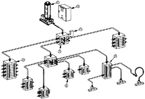 5、單泵多區(qū)域給油方式 這種給油方式特別適合于長達數(shù)百米的軋制機組上使用。 由中央泵把油脂送入F50mm左右的主管,再由主管送往各區(qū)域的分管,分管上裝有電磁閥,通過電磁閥的開與閉,可以間斷地將潤滑脂送到各區(qū)域的分配器,再向潤滑點給脂。 使用這種系統(tǒng),可以對數(shù)千個軸承都能用一臺中央泵自動地進行給脂