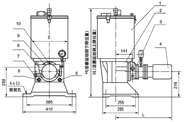 1、貯油筒;2、泵座;3、帶連結法蘭的柱塞泵裝置;4、減速電機5、加油口G3/4; 6、回油口G3/4;7、調壓安全閥;8、出油口G3/4;9、過濾器;10、單向閥 |