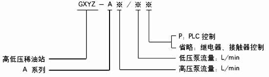 如采用A系列,高壓流量為2.5L/min;高壓壓力為31.5MPa,低壓供油壓力為0.4MPa;而低壓供油量為40L/min的高(低)壓稀油站,采用PLC控制的則按如下方法標注:GXYZ-A2.5/40.P