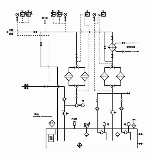 | 本油站為整體式,由油箱、兩臺低壓油泵、一臺高壓油泵、二臺雙筒網片式過濾器、回油磁網過濾裝置、列管式油冷卻器、各種控制閥門、管道以及電接點壓力表、鉑熱電阻等組成。 工作原理基本上也和A系列相同;但B系列的低壓油經過過濾和冷卻后外供時,一部分低壓油通過旁路再經過一個雙筒過濾器后才進入高壓泵的吸油口,以提高高壓油的清潔度等級;但應注意當低壓供油實際壓力較小時(例如小于0.2MPa時),由于后一過濾器同樣也有壓差損失(也隨時間逐步增大),為保證高壓油泵順利吸入,吸入口應始終保證正壓(當后過濾器切換前壓差達最大時也必須滿足這一要求);除 流量和A系列有很大不同外,最主要特點(結構特征)為高壓泵吸口前有另一臺過濾器。 其他工作原理和操作控制可參見A系列所述。 | |||||||||||||||||||||||||||||||||||||||||||||||||||||||||||||||||||||||||||||||||||||||||||||||||||||||||||||||||||||||||||||||||||||||||||||||||||||||||||||||