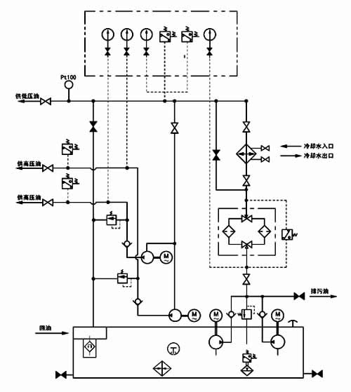 稀油站二根高壓輸出管道的壓力均為31.5MPa,流量各為2.5L/min,低壓部分的壓力為0.4MPa,低壓流量為16~100L/min;稀油站具有過濾、冷卻、加熱等裝置和聯鎖、報警、自控等功能。