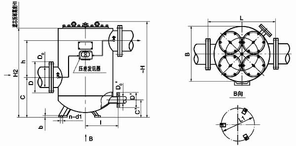 | 法蘭標準:GB573-65(可根據需要確定):DN100、150-3 組濾芯組件 DN200-4 組濾芯組件;壓差發訊器為選配件。 |