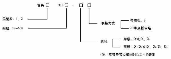 2、標記示例: (1)單管夾,單層,管徑D=18,帶底板 管夾1HZJ50-18B (2)單管夾,雙層,上層管徑D1=18,下層管徑D2=22,帶底板 管夾1HZJ50-18/22B (3)雙管夾,單層,管徑不同,D1=18,D2=22,帶底板 管夾2HZJ50-18、22B (4)雙管夾,單層,管徑相同,D1=D2=18,帶底板 管夾2HZJ50-2×18B (5)雙管夾,單層,管徑相同,D1=D2=18,不帶底板 管夾2HZJ50-2×18 (6)雙管夾,雙層,管徑不同,上層管徑D1=16,D2=18,下層管徑D2=20,D4=22,帶底板 管夾2HZJ-16、18/20、22B (7)雙管夾,雙層,每層管徑相同,上層管徑D1=D2=18,下層管徑D3=D4=22,帶底板 管夾2HZJ-2×18/2×22B (8)單、雙管夾,雙層,上層為單管夾,管徑D1=18,下層為雙管夾,管徑D2=D3=22,帶底板 管夾1/2HZJ50-18/2×22B (9)雙管夾,雙層,管徑D1=16,D2=18, D3=D4=22,帶底板 管夾2HZJ50-16、18/2×22B |